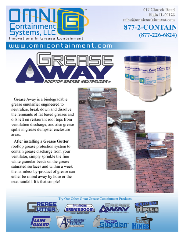 Grease Away is a biodegradable grease emulsifier engineered to neutralize, breakdown and dissolve the remnants of fat based greases and oils left on service providers roof tops from ventilation discharge, and also grease spills in grease dumpster enclosure areas.